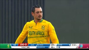 वहीं इससे पहले वह साल 2020 में 17 गेंद में इंग्लैंड के विरुद्ध भी कॉक फिफ्टी लगा चुके हैं। इसके साथ-साथ क्विंटन डी कॉक (Quinton de Kock) टी20 अंतर्राष्ट्रीय में अपना शतक भी पूरा कर लिया। इस पारी में उन्होंने 9 बेहतरीन चौके और 6 आतिशी छक्कों के साथ मात्र 43 बॉल में ही अपना शतक पूरा किया। हालाँकि शतक जड़ने के अगली ही गेंद पर वे आउट हो गए।